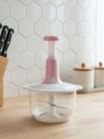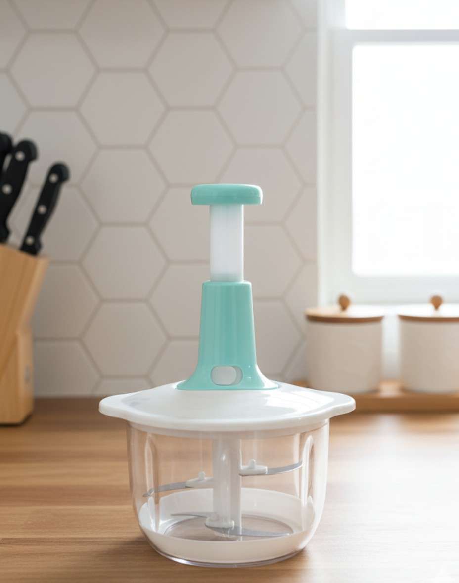 Compact hand chopper with stainless steel blades.