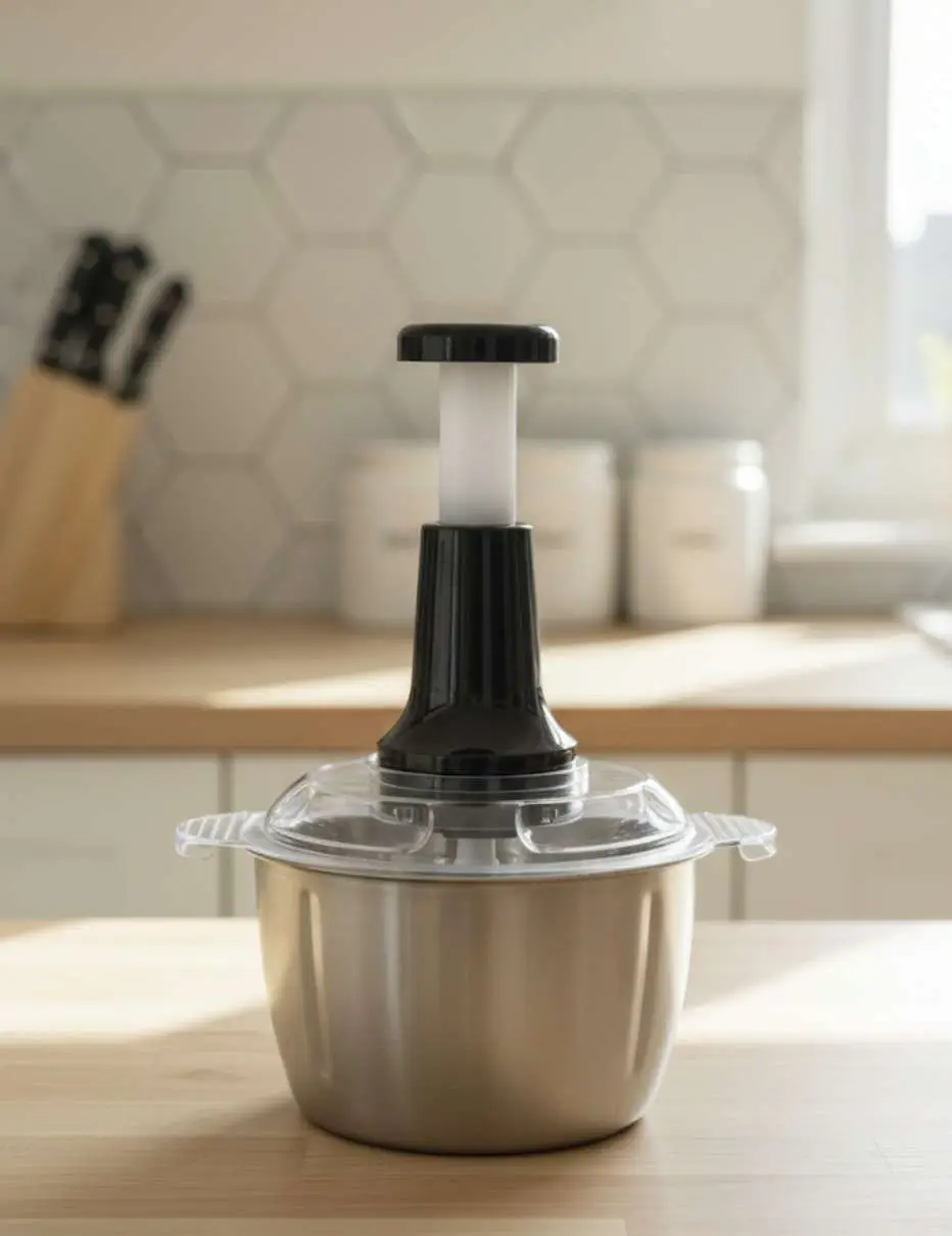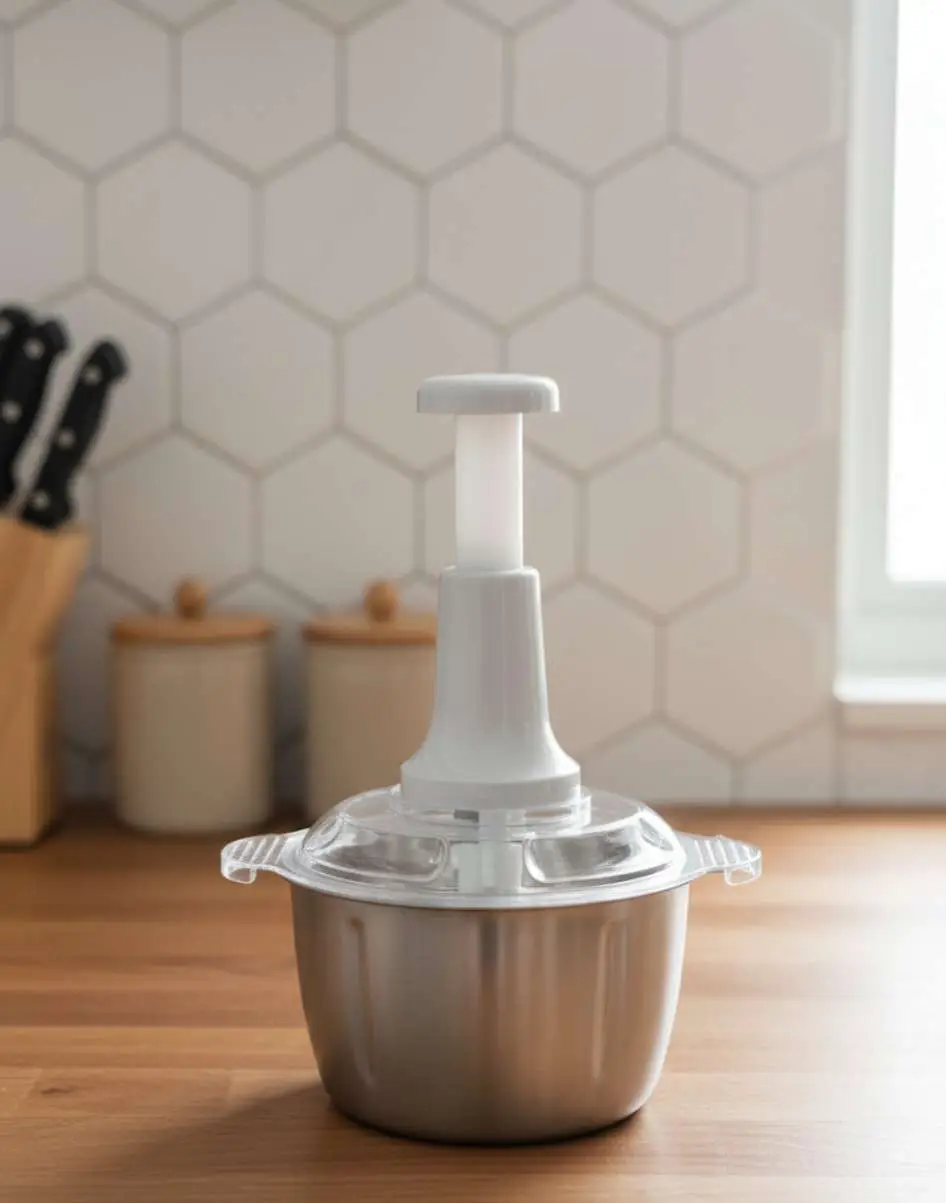 This multifunction hand chopper quickly chops vegetables, fruits, nuts, and more. Stainless steel body with sharp blades ensures efficient chopping. A quick cook tool for onions, garlic, ginger and nuts.